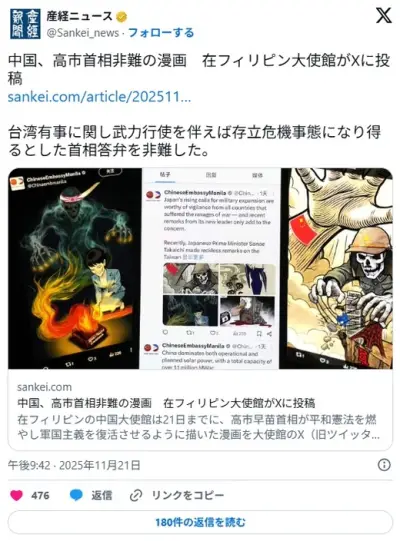 中国、高市首相非難の漫画 在フィリピン大使館がXに投稿