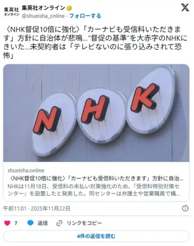 【NHK】受信料の未払い督促を10倍に強化… 支払い拒否が続くと民事手続きも 「カーナビも受信料いただきます」方針