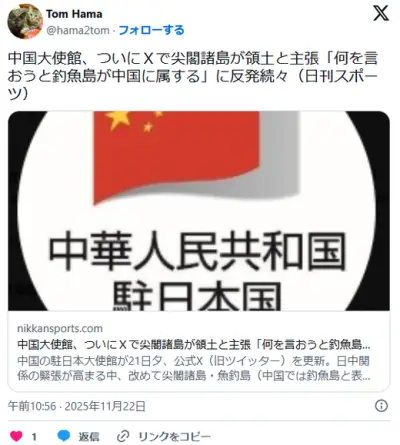 中国大使館、ついにXで尖閣諸島が領土と主張「何を言おうと釣魚島が中国に属する」に反発続々