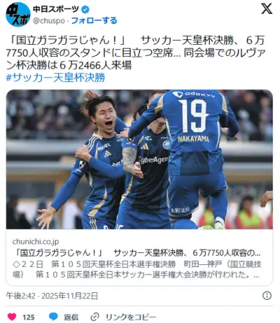 【サッカー】「国立ガラガラじゃん!」 「タダ券ばら撒かないんだっけ?」天皇杯決勝、6万7750人収容のスタンドに目立つ空席