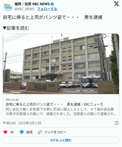 20代の会社員女性、忘れ物を取りに帰宅したら上司の47歳男がパンツ姿で布団の上に 福岡県