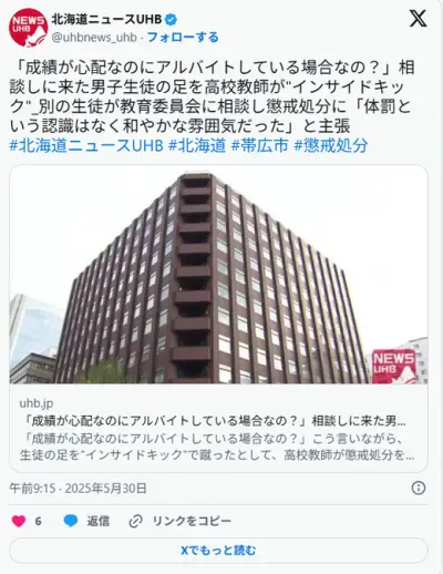 【北海道札幌】「成績が心配なのにアルバイトする場合なの?」相談した生徒の足を高校教師がインサイドキック「和やかな雰囲気だった」