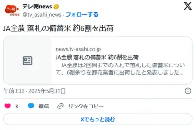 【コメ】JA全農 落札の備蓄米 約6割を出荷