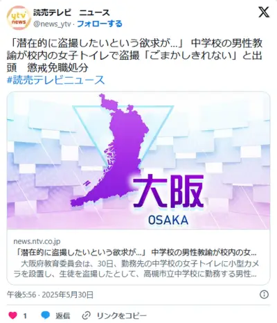 【大阪】「潜在的に盗撮したいという欲求が…」 中学校の男性教諭が校内の女子トイレで盗撮「ごまかしきれない」と出頭 懲戒免職処分