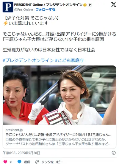 そこじゃないんだわ…妊娠・出産アドバイザーに9億かける「三原じゅん子大臣はご存じない」少子化原因