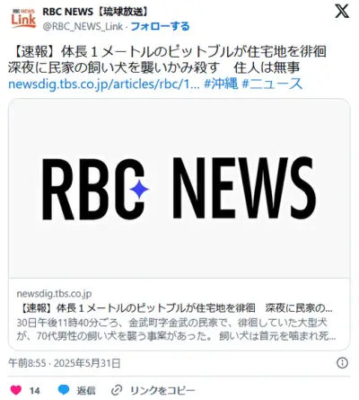 【沖縄】体長1メートルのピットブルが住宅地を徘徊 深夜に民家の飼い犬を襲いかみ殺す 住人は無事