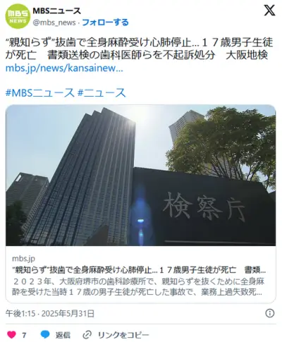 “親知らず”抜歯で全身麻酔受け心肺停止…17歳男子生徒が死亡 書類送検の歯科医師らを不起訴処分 大阪地検