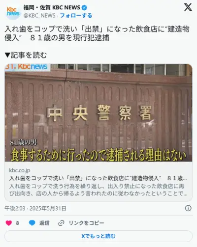 【福岡】入れ歯をコップで洗い「出禁」になった飲食店に”建造物侵入” 81歳の男を現行犯逮捕