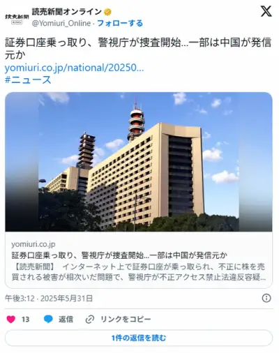 【証券口座乗っ取り】警視庁が捜査開始…一部は中国が発信元か