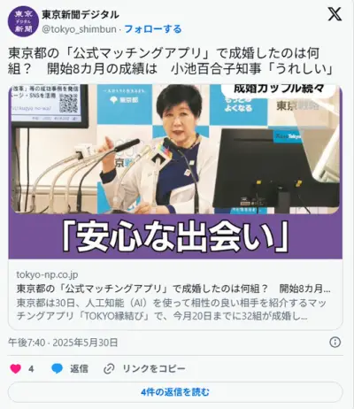 【マチアプ】東京都の「公式マッチングアプリ」で成婚したのは何組? 開始8カ月の成績は 小池百合子知事「うれしい」