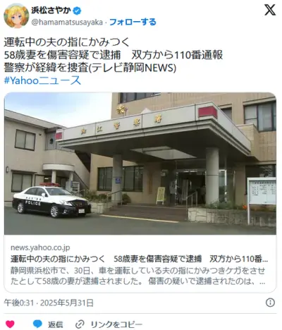【静岡】運転中の58歳夫の指にかみつく 58歳無職妻を傷害容疑で逮捕 双方から110番通報 警察が経緯を捜査 浜松