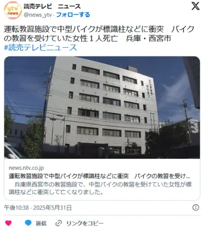 【兵庫】運転教習施設で中型バイクが標識柱などに衝突 バイクの教習を受けていた女性(29)1人死亡 西宮市