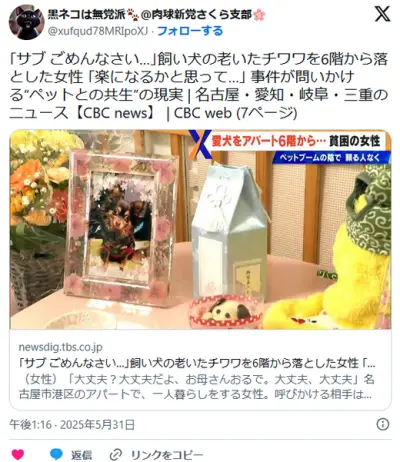「サブ ごめんなさい…」飼い犬の老いたチワワを6階から落とした女性 「楽になるかと思って…」 名古屋