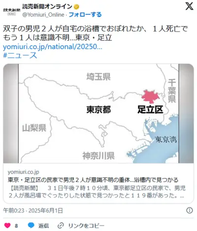 【東京】「しばらく目を離していた」 足立区の民家で1歳くらいの男児2人が意識不明の重体…浴槽内で見つかる