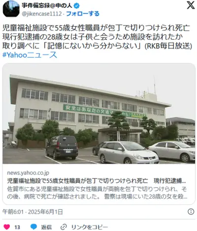 【佐賀】児童福祉施設で職員(55)が切りつけられ死亡 現場にいた女を殺人未遂の疑いで現行犯逮捕