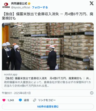 倉庫業者「米放出で倉庫が空き倉庫管理料がもらえなくなった。倉庫業止めます。」