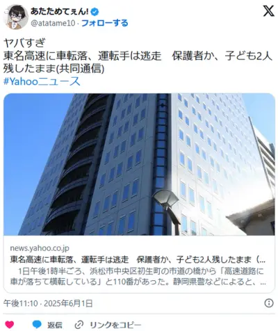 東名高速に車転落、運転手逃走 子ども2人けが、浜松