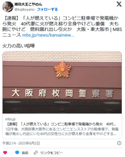 【大阪】夫婦げんか、発電機ガソリン引火し大やけど