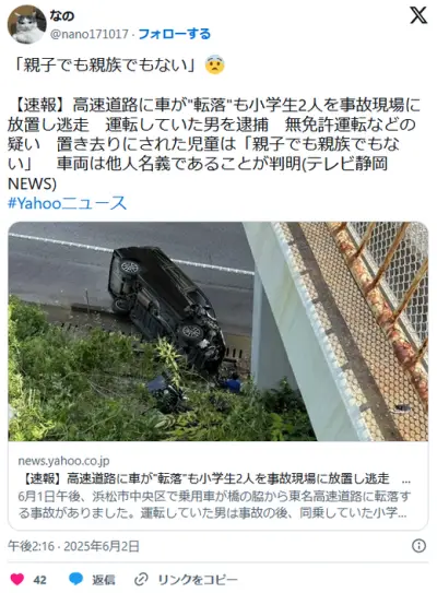 高速道路に車が転落、小学生2人を事故現場に放置 運転の男を逮捕 置き去りにされた児童は「親子でも親族でもない」車両は他人名義
