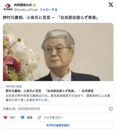 野村元農相、小泉氏に苦言 「自民部会諮らず発表」「自分で決めて自分で発表してしまう。ルールを覚えてもらわないといけない」