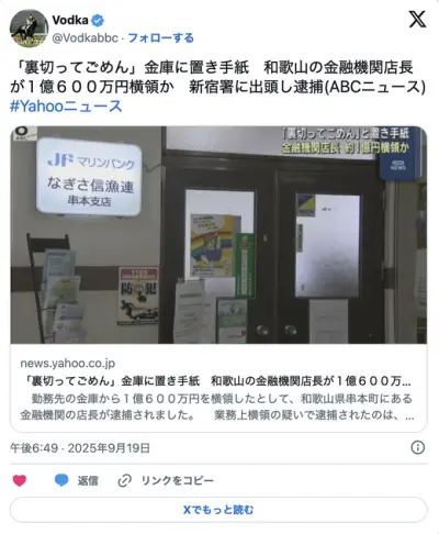 「裏切ってごめん」金庫に置き手紙 和歌山の金融機関店長・新田博志(44)が1億600万円横領