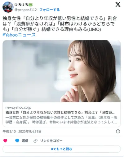【調査】独身女性「自分より年収が低い男性と結婚できる」割合は? 4人に1人は自分より年収が低い男性と結婚できると…