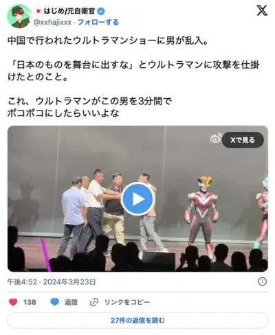 悲報】中国で行われたウルトラマンショーに男が乱入「日本のものを舞台に出すな」とウルトラマンに攻撃