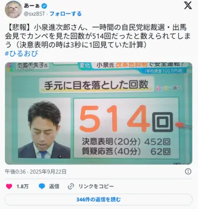 小泉氏 一時間の総裁選・出馬会見でカンペを見た回数が514回だったと数えられてしまう(3秒に1回)