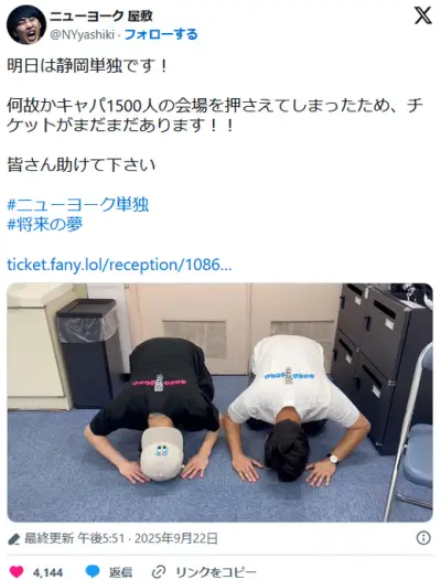 ニューヨーク屋敷「チケットがまだまだあります!! 皆さん助けて下さい」土下座でお願い