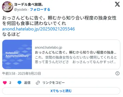 女さん 「おっさんどもに告ぐ。頼むから知り合い程度の独身女性を何回も食事に誘わないでくれ」