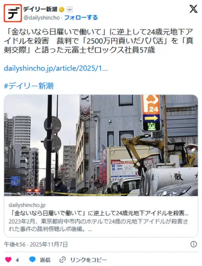 「金ないなら日雇いで働いて」に逆上して24歳元地下アイドル殺害 「2500万円貢いだパパ活」を「真剣交際」 元富士ゼロックス社員57歳
