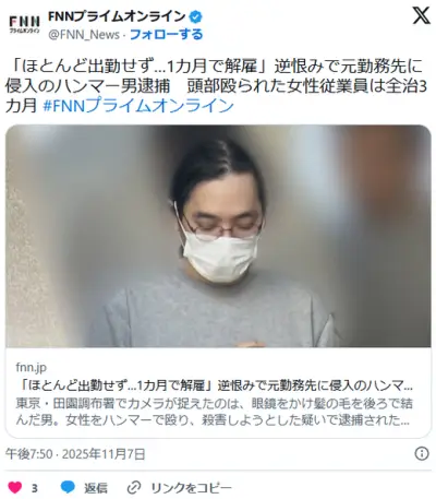 突如解雇された恨みで勤務先を襲撃、ハンマーで頭部殴打 なお解雇理由は試用期間1ヶ月ほぼ出勤せず