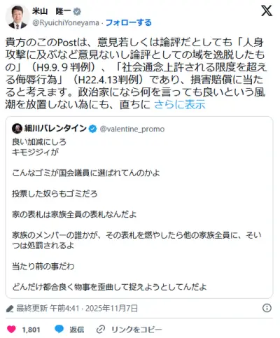 米山隆一氏、細川バレンタイン氏へ法的措置検討 「国旗損壊罪」の解釈巡る自身へのポストに「こんなゴミが…」などと投稿