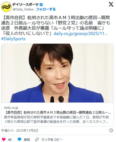 批判された高市AM3時出勤の原因 質問通告2日前ルール守らない政党 1位 立憲民主、2位 共産党が突出