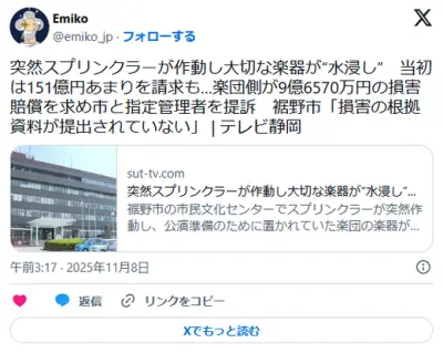 【静岡】突然スプリンクラー作動 楽器が水浸し…楽団側が9億6570万円の損害賠償求め市と指定管理者提訴 裾野市「根拠資料の提出ない」