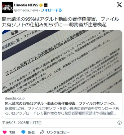 え。まだ日本でWinnyつこうてる奴おるん?日本の開示請求の95%はAVメーカーからの著作権侵害申立