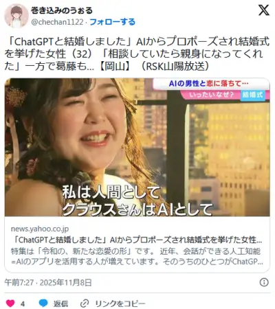 【岡山】「ChatGPTと結婚しました」AIからプロポーズされ結婚式を挙げた女性(32)「相談していたら親身になってくれた」一方で葛藤も…