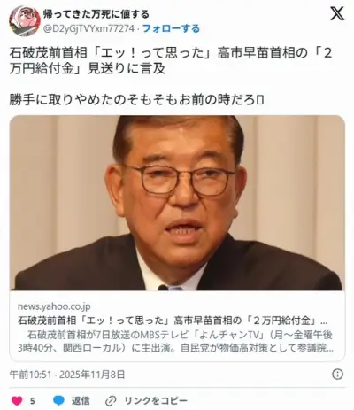 石破茂前首相「エッ!って思った」高市早苗首相の「2万円給付金」見送りに言及
