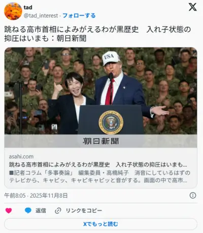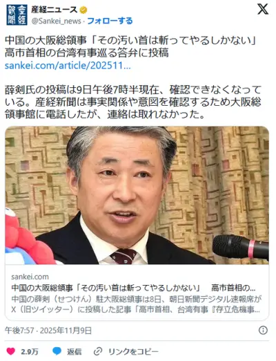 中国の大阪総領事「その汚い首は斬ってやるしかない」 高市首相の台湾有事巡る答弁に投稿