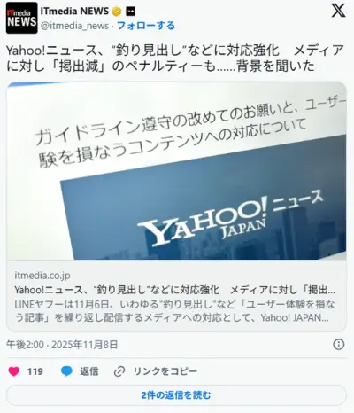 【Yahoo!ニュース】“釣り見出し”などに対応強化 メディアに対し「掲出減」のペナルティーも