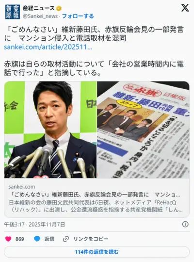 維新藤田「赤旗記者がマンションに侵入したという発言はデマでした。ごめんなさいでした