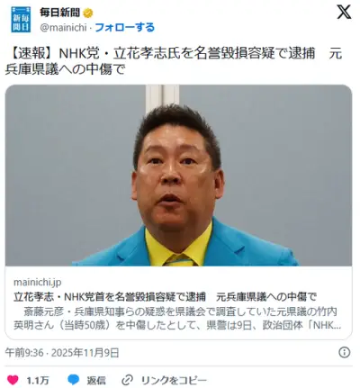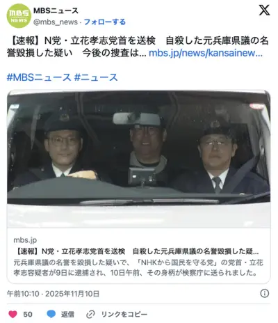 【速報】NHK党・立花孝志氏を名誉毀損容疑で逮捕 元兵庫県議への中傷で