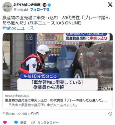 【熊本】農産物の直売場に車突っ込む 80代男性「ブレーキ踏んだら前に進んだ」 八代