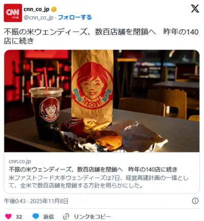 【米国】不振のウェンディーズ、数百店舗を閉鎖へ 昨年の140店に続き