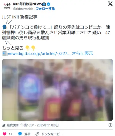無職(47)、パチンコで負けた腹いせにコンビニの陳列棚を倒す