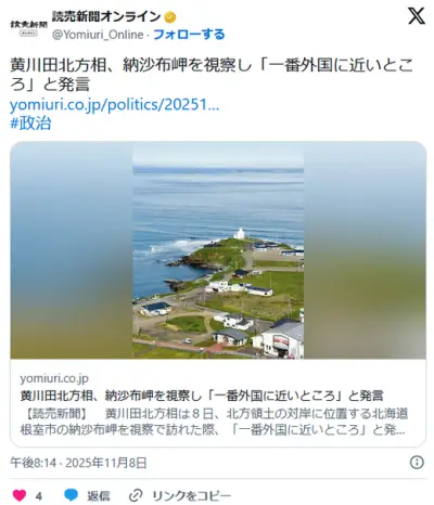 【黄川田北方相】納沙布岬を視察し「一番外国に近いところ」と発言 北方領土を外国扱い?
