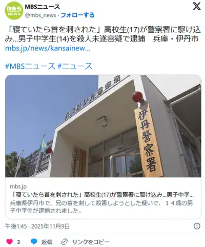 【兵庫】「寝ていたら首を刺された」兄を刺して殺害しようとした疑いで、男子中学生14歳を逮捕 深夜1時、家に両親不在 伊丹市