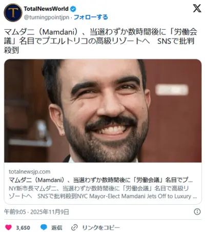 NY市長マムダニ氏、当選わずか数時間後に労働会議名目でプエルトリコの高級リゾートへ 批判殺到
