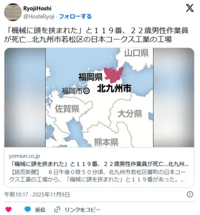 「機械に頭を挟まれた」と119番、22歳男性作業員が死亡…北九州市若松区の日本コークス工業の工場