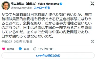 鳩山由紀夫氏「台湾有事はあくまで台湾は中国の内政問題、日本が関わってはならない」
